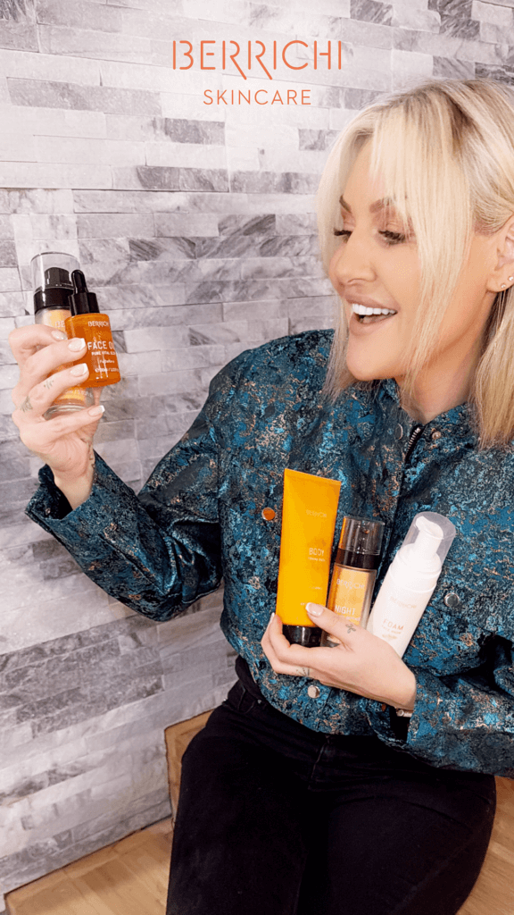 Tema igapäevane rutiin algab ja lõpeb puhastusega ning jätkub Berrichi toodetega: Näopuhastustoonik, Berrichi seerum, kreem ja näoõli. See on kindel süsteem, millest ta kinni peab nii hommikul kui ka õhtul. Berrichi tooted on olnud tema lemmikute hulgas juba aasta või kaks – ja mitte juhuslikult.